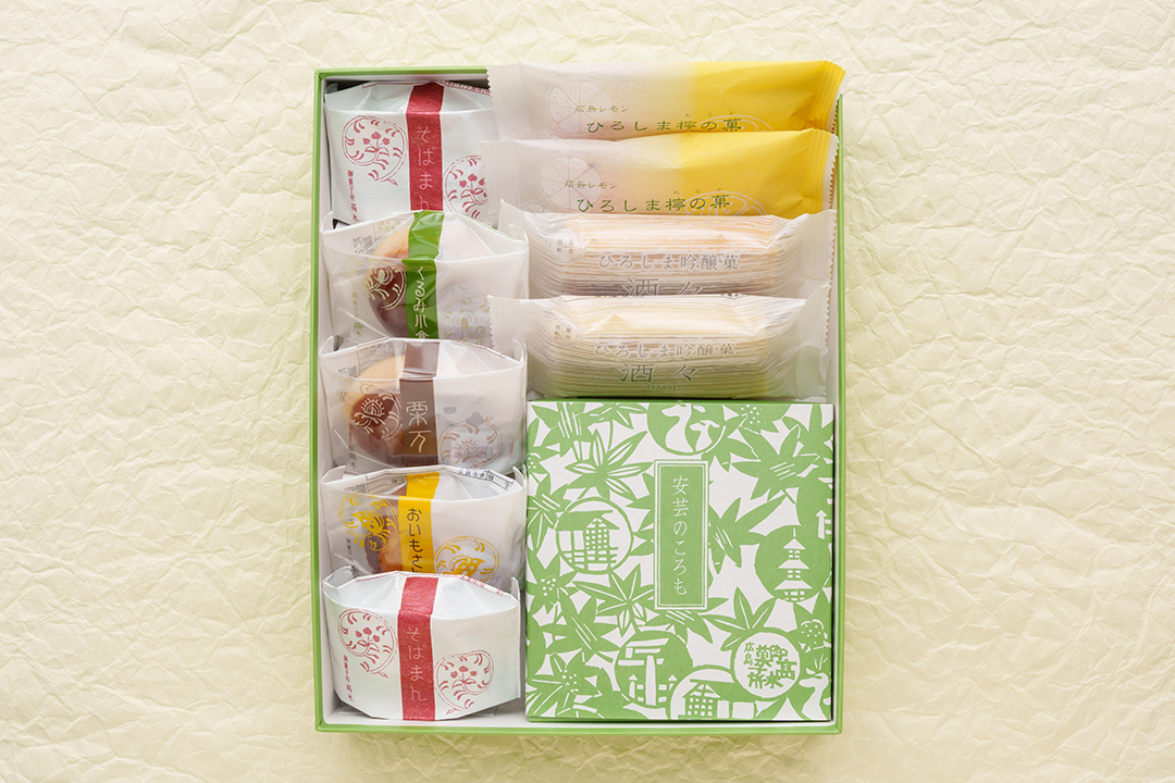 ひろしま檸の菓・ひろしま吟醸菓酒々・安芸のころも・焼菓子といった弊社ベストセラーの詰合せです。進物に好適です。