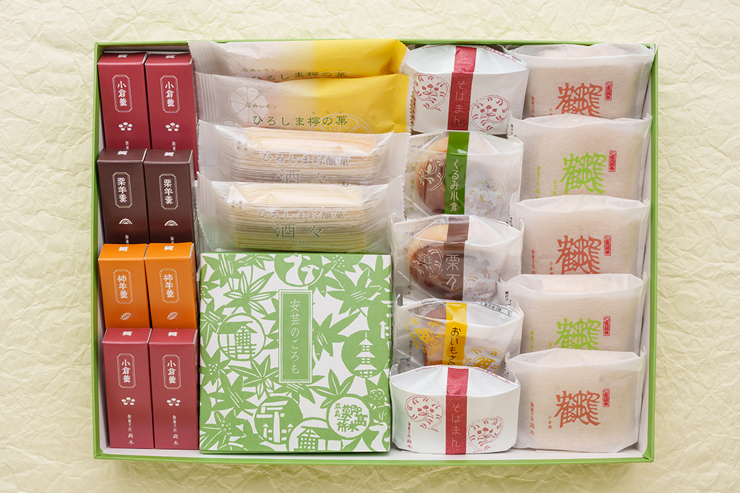 小型羊羹・鶴亀もなか・ひろしま檸の菓・ひろしま吟醸菓酒々・安芸のころも・焼菓子など弊社ベストセラーの詰合せです。進物に好適です。