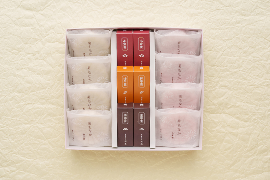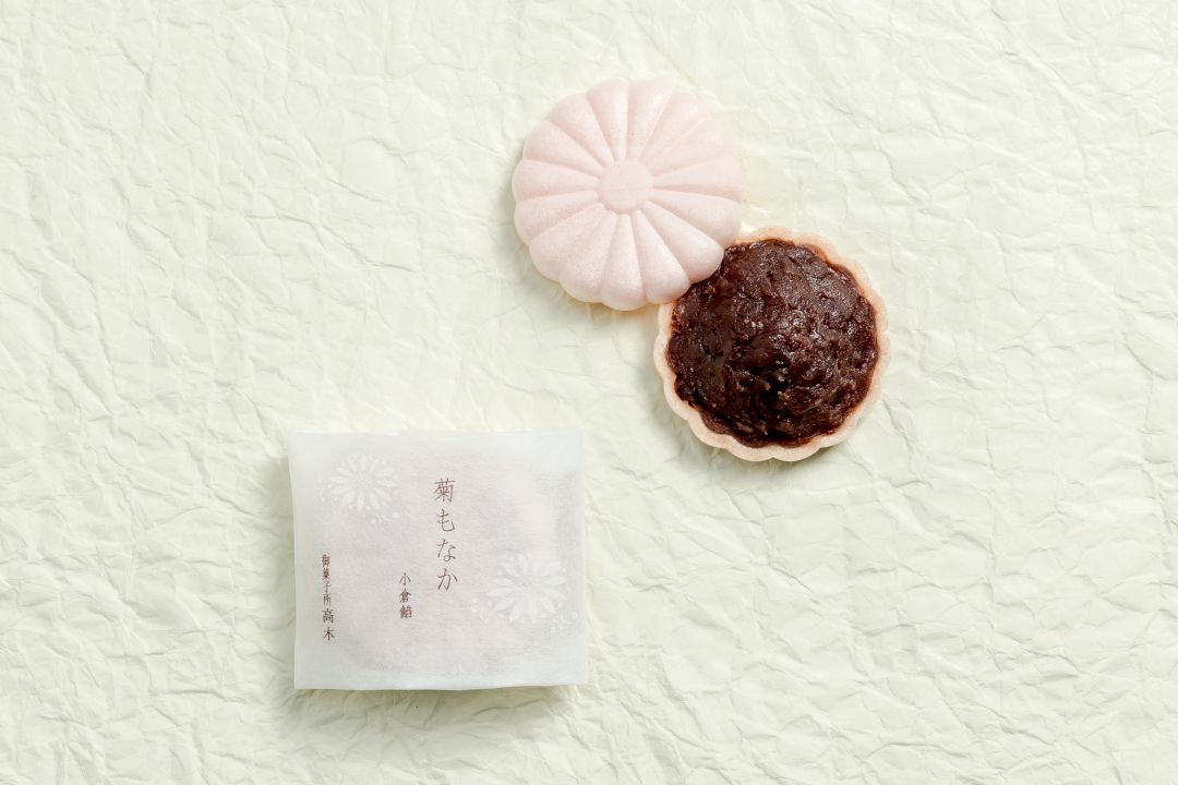 菊もなか…菊はその強い香りが邪気を払い、長寿の効能があると信じられてきたと言われています。備中大納言の粒餡と挽茶餡の2種を慶事にふさわしい紅白のもなか種に詰めております。