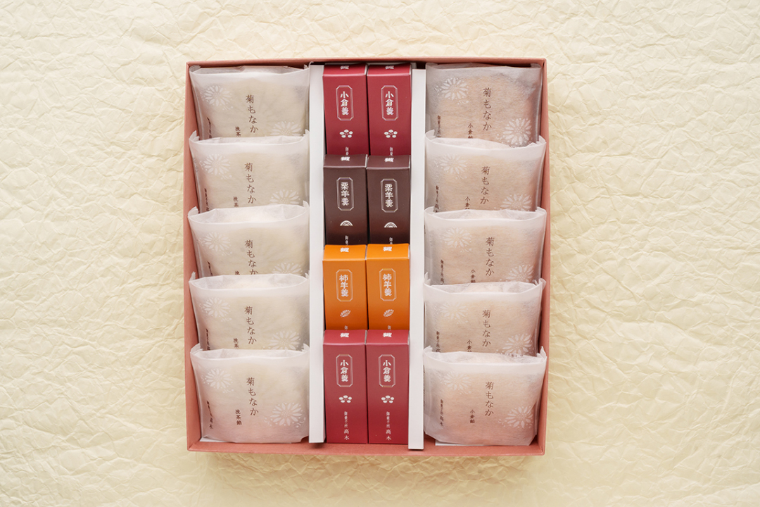 菊もなか…菊はその強い香りが邪気を払い、長寿の効能があると信じられてきたと言われています。備中大納言の粒餡と挽茶餡の2種を慶事にふさわしい紅白のもなか種に詰めております。