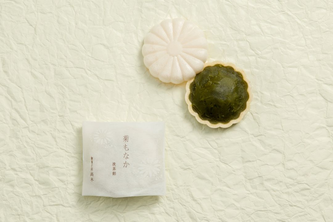 菊もなか…菊はその強い香りが邪気を払い、長寿の効能があると信じられてきたと言われています。備中大納言の粒餡と挽茶餡の2種を慶事にふさわしい紅白のもなか種に詰めております。